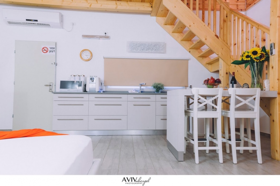 - Cuisine entièrement équipée: coin café, cuisinière électrique, plateau de Shabbat, micro-ondes, plats de service.